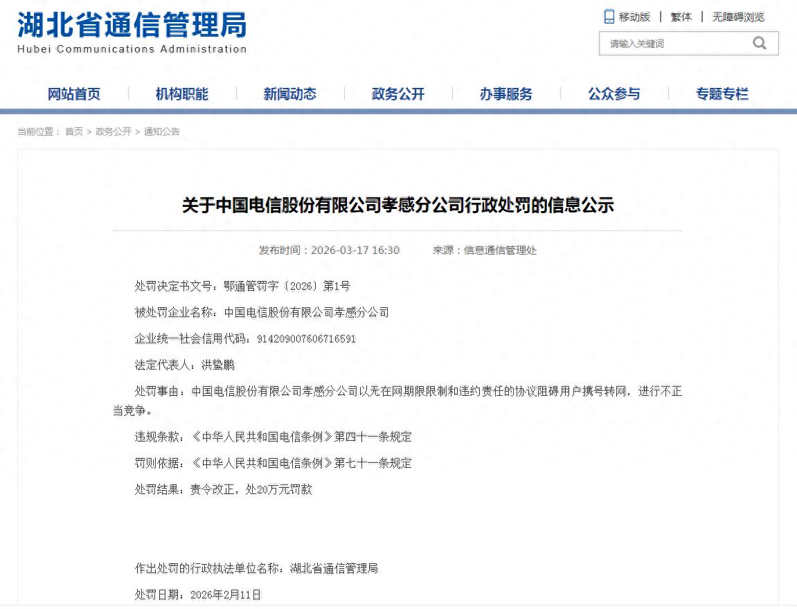 中国电信一分公司因阻碍用户携号转网,被湖北省通信管理局罚款20万元